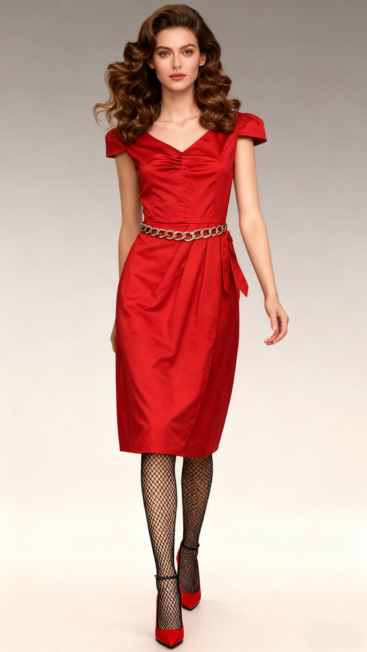 Turquoise Vintage 50s Sweetheart V-Neck Cap Sleeve Ruched Tie-Waist Midi Dress | Cocktail Garden Party Wedding