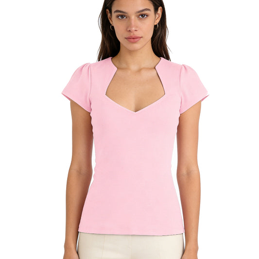 Women's Notch V-Neck Fitted T-Shirt | Elegant Short Sleeve Top in Red, Black, Pink, White