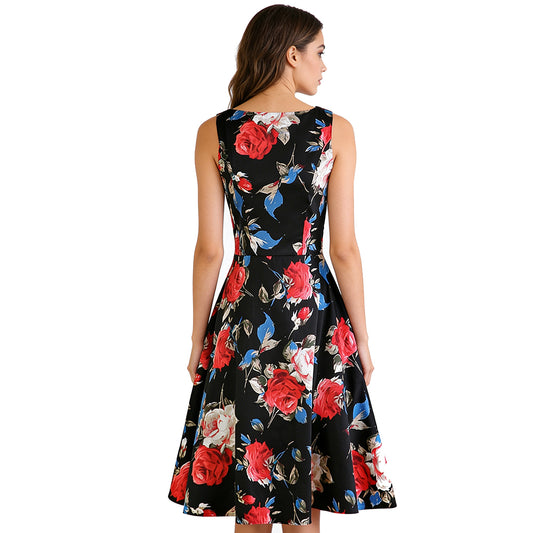 A Wardrobe Essential: Black Sleeveless Dress Blending Roses and Floral Designs
