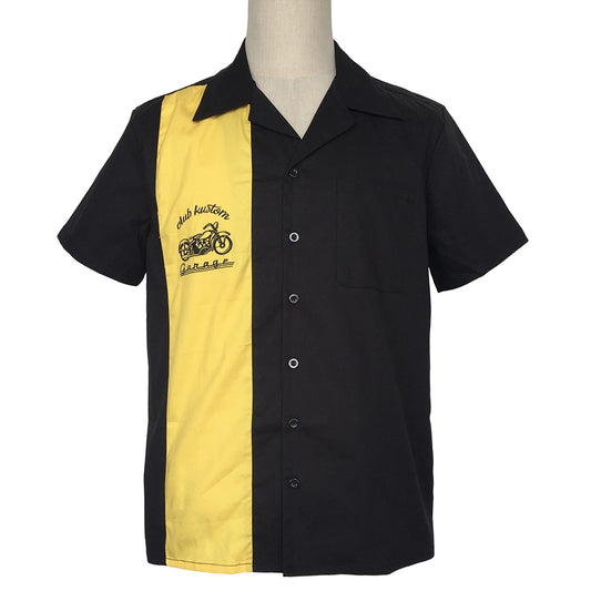 Men's Vintage Rockabilly Bowling Shirt | Black Yellow Motorcycle Embroidered Camp Collar Top