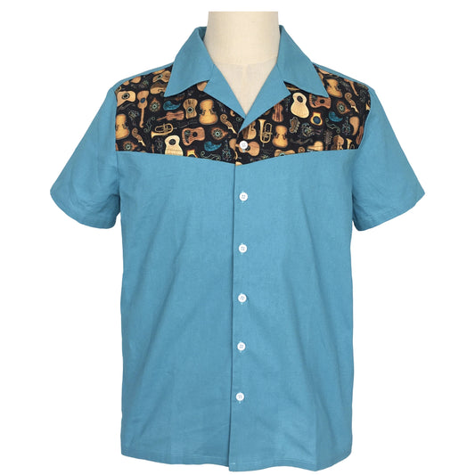 Men's short sleeved shirt guitar color blocked cotton loose casual fake pocket original design