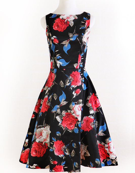A Wardrobe Essential: Black Sleeveless Dress Blending Roses and Floral Designs