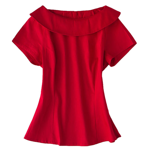 Retro Vibe Close - up | Red Boat - Neck Off - Shoulder Top, 100% Cotton Classic
