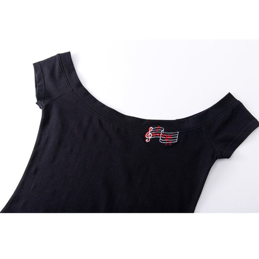 Off - Shoulder Black Top with Music Note Embroidery - Women's Casual Short - Sleeve Tee