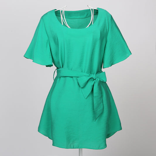 Eye - Catching Green Tunic with Bow - Tie Waist and Flared Sleeves