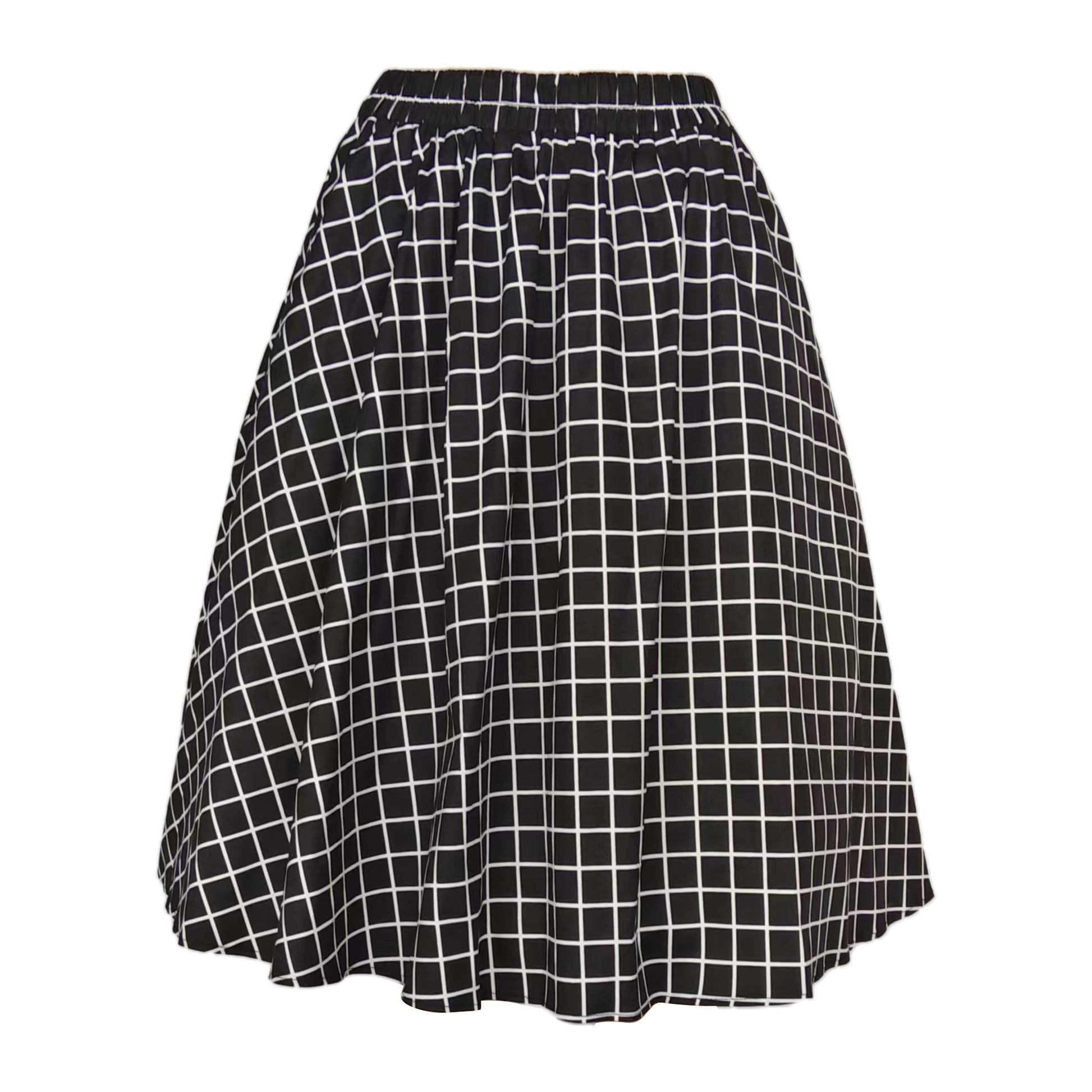 Women's Black White Grid A-Line Midi Skirt - Elastic Waist Flared Swing Skirt