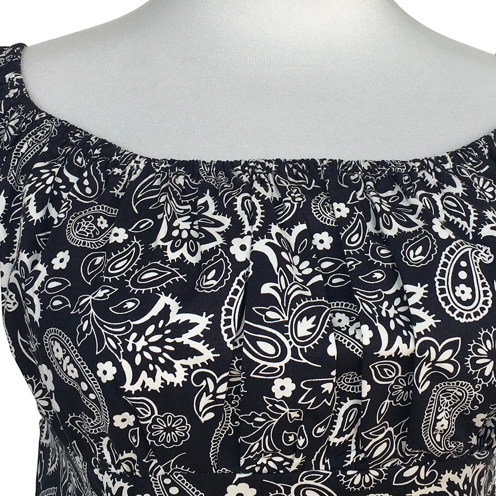1950s Rockabilly Pinup Off Shoulder Top - Black White Paisley Print Ruched Flattering Retro Blouse