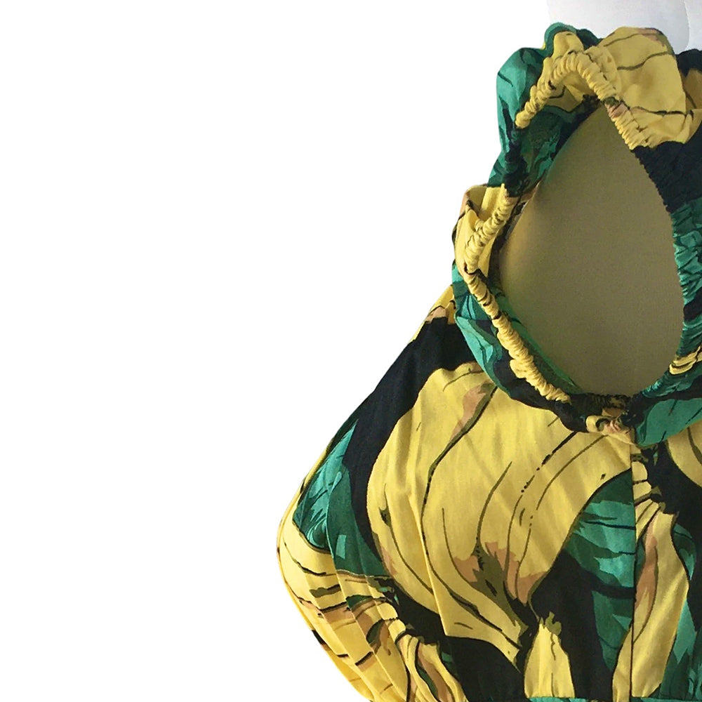 The bold yellow banana pattern (paired with lush green leaves) pops against the dark base, while the off-shoulder neckline frames your collarbone perfectly. The slim-fit silhouette cinches your waist, and the elastic ruffled bust ensures a comfortable, flattering fit for all body types.