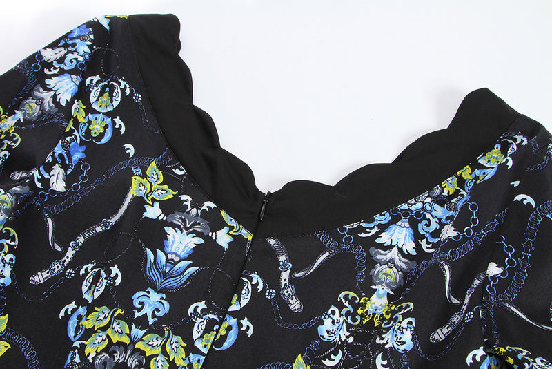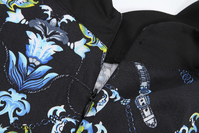 • Vibrant Floral Print: Featuring a beautiful array of blue, yellow, and white florals on a classic black background, the print is eye-catching yet sophisticated, bringing a vintage flair to your look.